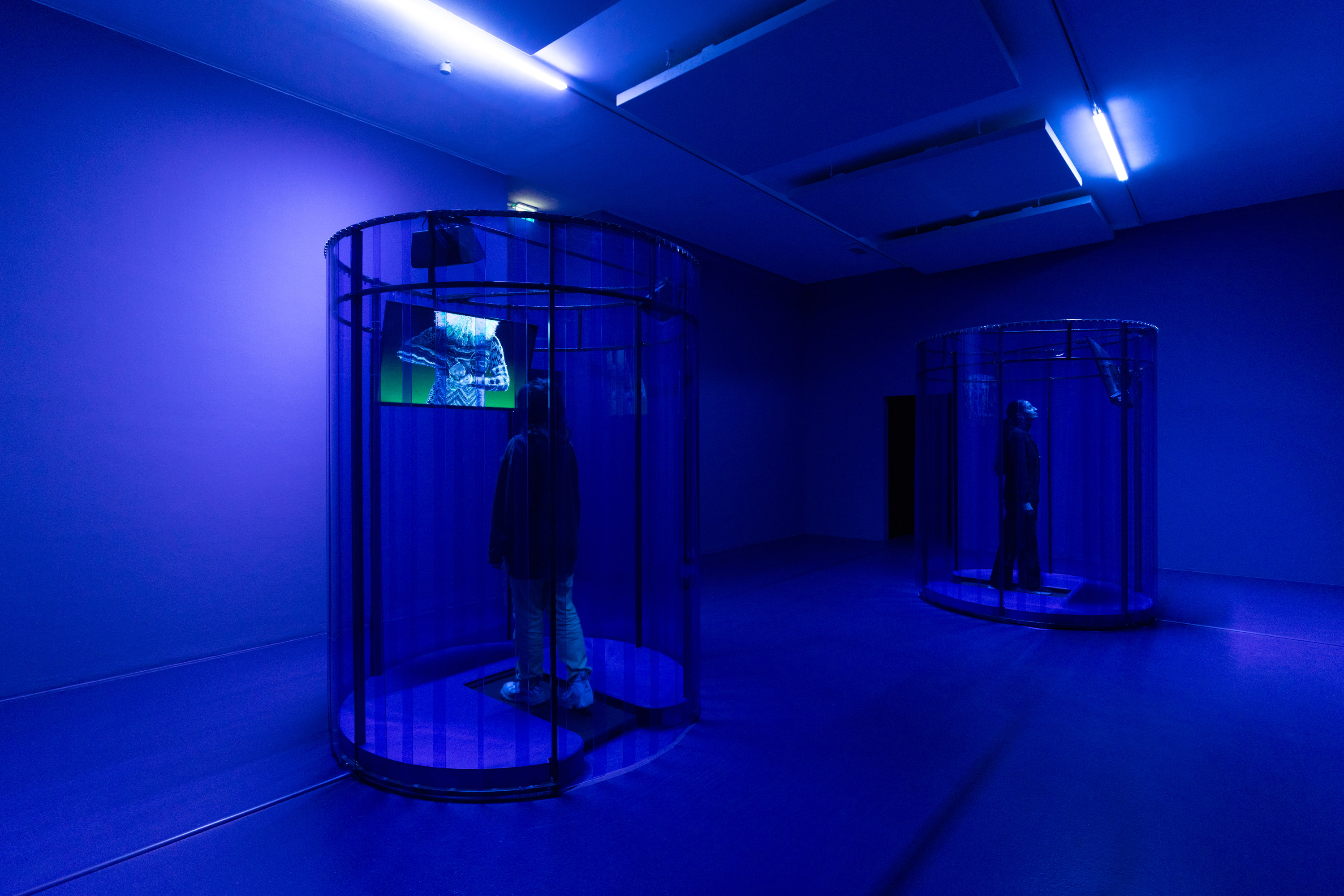 Joséfa Ntjam, Dislocations, 2022-2025. Vue de l’exposition INTRICATIONS à l’IAC Villeurbanne, 2025. Courtesy de l’artiste © ADAGP, Paris, 2025. Photo : Ivan ErofeevParce que c’est en ligne, comme beaucoup, que Josèfa Ntjam explore les zones d’ombre d’une histoire coloniale encore vastement méconnue. Ntjam tire de ses recherches des films, des sculptures en laiton (Medusa, 2024), des photomontages et des jeux vidéo mettant en scène ses interrogations de manière sensible, espérant influer sur notre inconscient. Dans le film Dislocation (2022), des avatars de l’artiste nous racontent la guerre d’indépendance du Cameroun (1955-1971) d’une voix synthétique. Une fois passés les sous-bois de la première salle, nous entrons dans l’histoire comme dans une épopée sensible et hyper numérique. « Cette obsession numérique est née dans ma jeunesse, se souvient Josèfa Ntjam. J’ai eu accès à un ordinateur très tôt chez mes parents. Internet a été un lieu d’apprentissage et de réinvention. C’est un territoire qui n’a pas de centre, traversé de liens, de zones floues, de détours. J’y ai trouvé une manière de penser proche du collage, de l’association libre, du rêve. » L’esthétique du web, ses couleurs franches — bardant tous les murs de l’exposition — autant que ses logiques d’hypertexte, de flux et de glissement, lui ont permis « de traduire une pensée diasporique, fragmentaire, non linéaire. J’y vois une forme d’architecture mentale, mouvante, où chaque clic ouvre un passage vers un autre récit possible. »