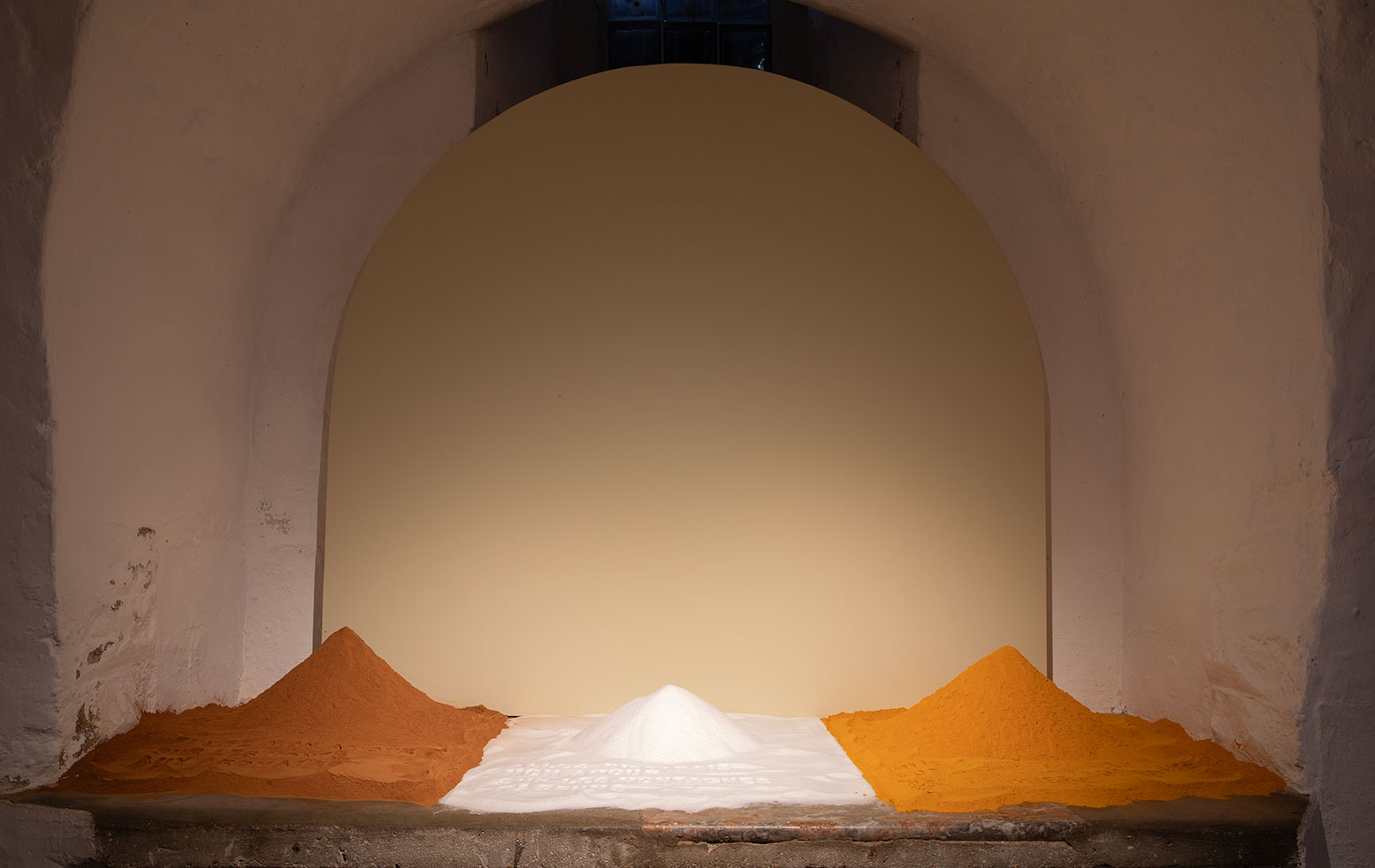 Le Chant de sables que propose Bennequin est une affaire de sensations : outre l’invitation à charrier le sable de ses mains, trois collines de sel, de curcuma et de cannelle diffusent leurs parfums et participent de cette retranscription d’une géographie sensorielle. Non loin dans l’espace d’exposition, des pierres apparaissent comme des échos aux symboles évoqués dans le texte : l’une se confond avec un sexe, l’autre avec un bénitier, quand la dernière sert de repose-plume – mais de plumes d’oiseau. Dans les deux vidéos présentées, le mouvement de l'eau claire recouvre des phrases inscrites qui défilent à même la plage tandis que, dans la Crypte, des kilos de sable lestent le sol de lettres, d’objets et autres coquillages échoués et immobiles.