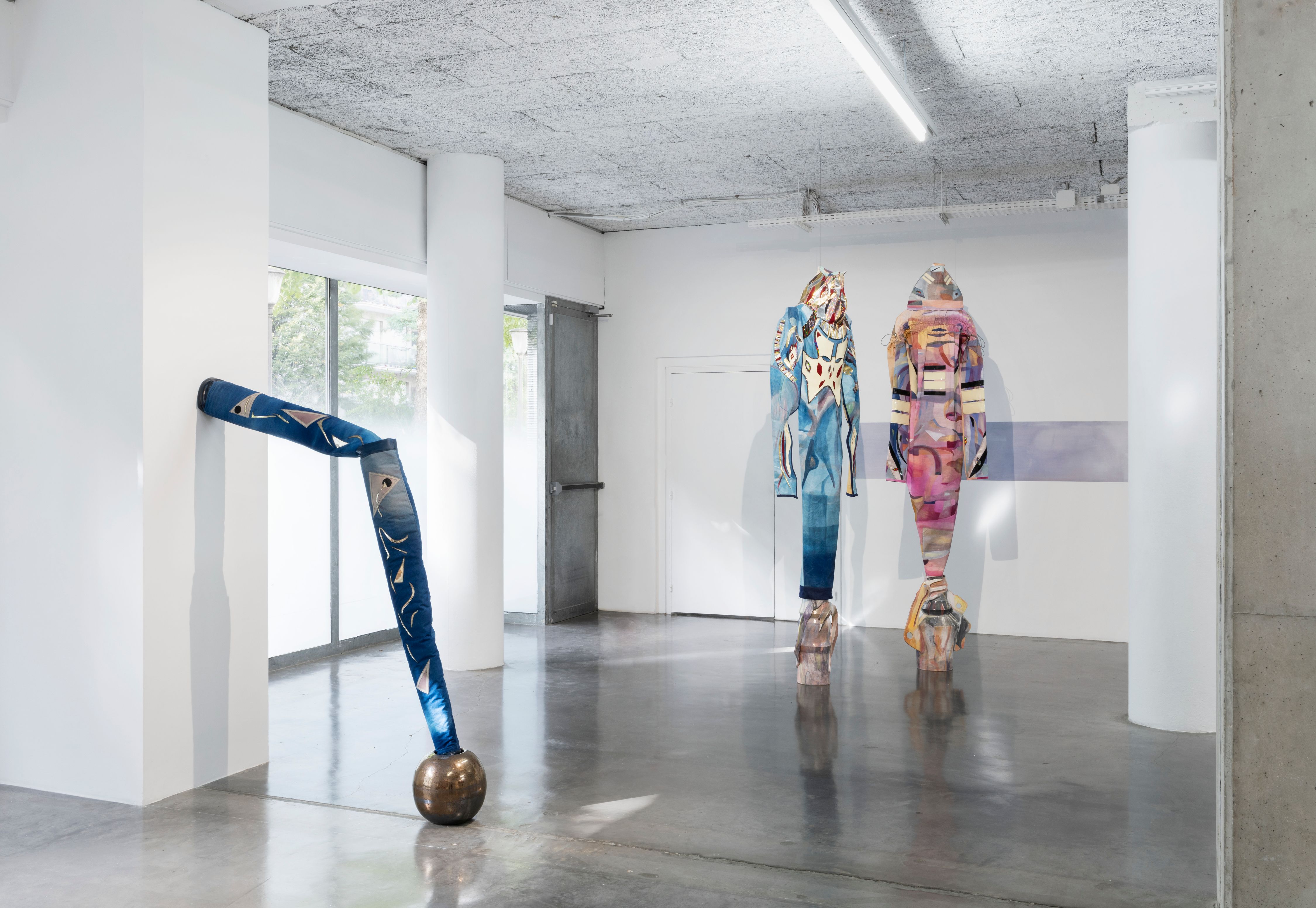 Vue de l'exposition de Mathilde Denize au Plateau © Photo Tanguy Beurdeley - Courtesy de l'artiste et de la galerie Perrotin.jpgDans « Camera Ballet », chaque pièce est pensée comme un élément de décor de théâtre ou d’opéra, à l’image de cette grande cape ouvragée d’empiècements de peinture surmontée d’une collerette. L’imaginaire fantastique de l’artiste nimbe tout l’espace. Des escaliers, des châteaux abandonnés, des monstres et des montagnes se distinguent dans la brume du paysage, esquissant un monde fantaisiste, proche de ces jeux vidéo gothiques inspirés de l’époque médiévale. Des génies drapés des mêmes toiles aux teintes de crépuscule sortent d’amphores en céramique émaillée tournées par l’artiste. Ces deux spectres nous surplombent comme s’ils allaient nous délivrer la clef d’une énigme, l’exposition devenant une quête mystérieuse.