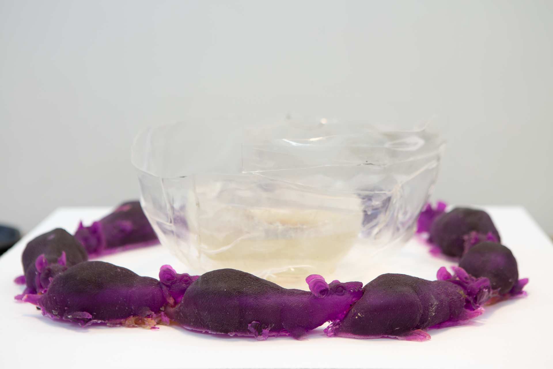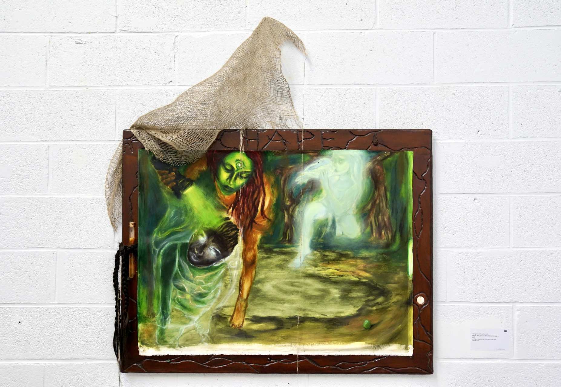Anders Dickson, Circular logic around nutrition. Photo : Sophia MairerAu milieu de la pièce, la scénographie tend de longs rideaux, dévoilant une installation de l’Américain Anders Dickson où des cartes à jouer, accrochées à un escabeau, dialoguent avec une petite horloge faite d’une tête de poupée rouge. Non loin de là, la toile Ignaminies et contre-décône (an ba fèy) d’Audrey Couppé de Kermadec montre une figure nue sur un fond vert marécage, tenant dans ses mains une substance gluante. Cette sorte de gelée renvoie au chlordécone, insecticide utilisé contre le charançon du bananier et qui continue de polluer les sols en Guadeloupe et en Martinique, dont l’artiste est originaire. Mais en passant derrière l’œuvre, on découvre qu’elle est enrichie par un autel d’objets : coquillages, encens, eau stagnante, fleurs séchées, ticket de cinéma pour un film d’Audre Lorde – autant d’outils pour transformer le poison en remède, s’émanciper du colonialisme contemporain et ouvrir des portails vers d’autres mondes.