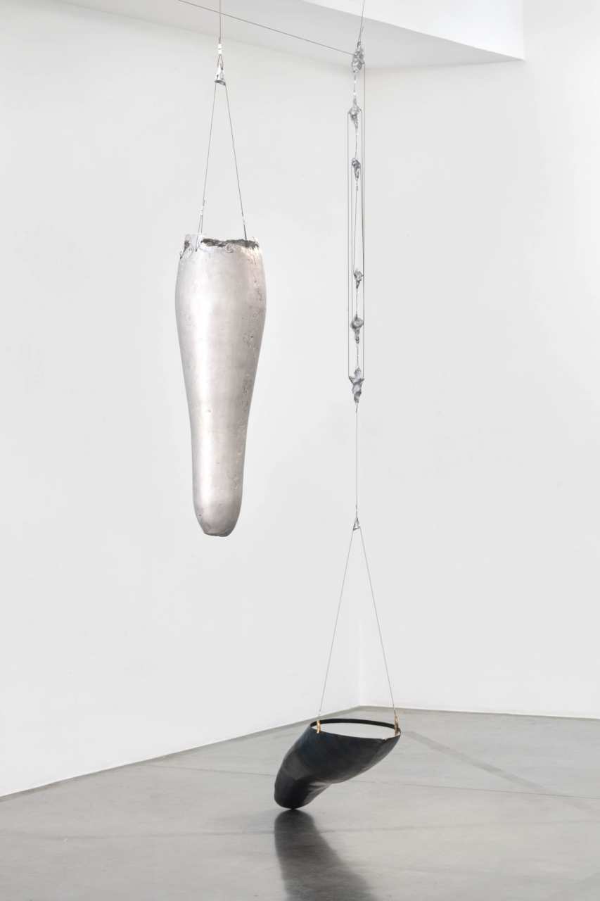 Avant que le magicien ne soit soupçonné d’arnaque, c’est l’alchimiste qui faisait figure de charlatan : au Moyen Âge, on lui reprochait ses ambitions contre-nature – transmuter les métaux en or, convertir le déchet en valeur. Avec deux sculptures d’acier et de bronze, toutes deux intitulées Aiguille, Romain Best invoque cette figure oubliée. L’une, verticale, semble être en lévitation, se déployant comme un vortex dans l’espace. L’autre, au sol, pointe vers une direction inconnue, comme une baguette magique ou la lame d’une arme tout droit sortie d’un jeu vidéo.