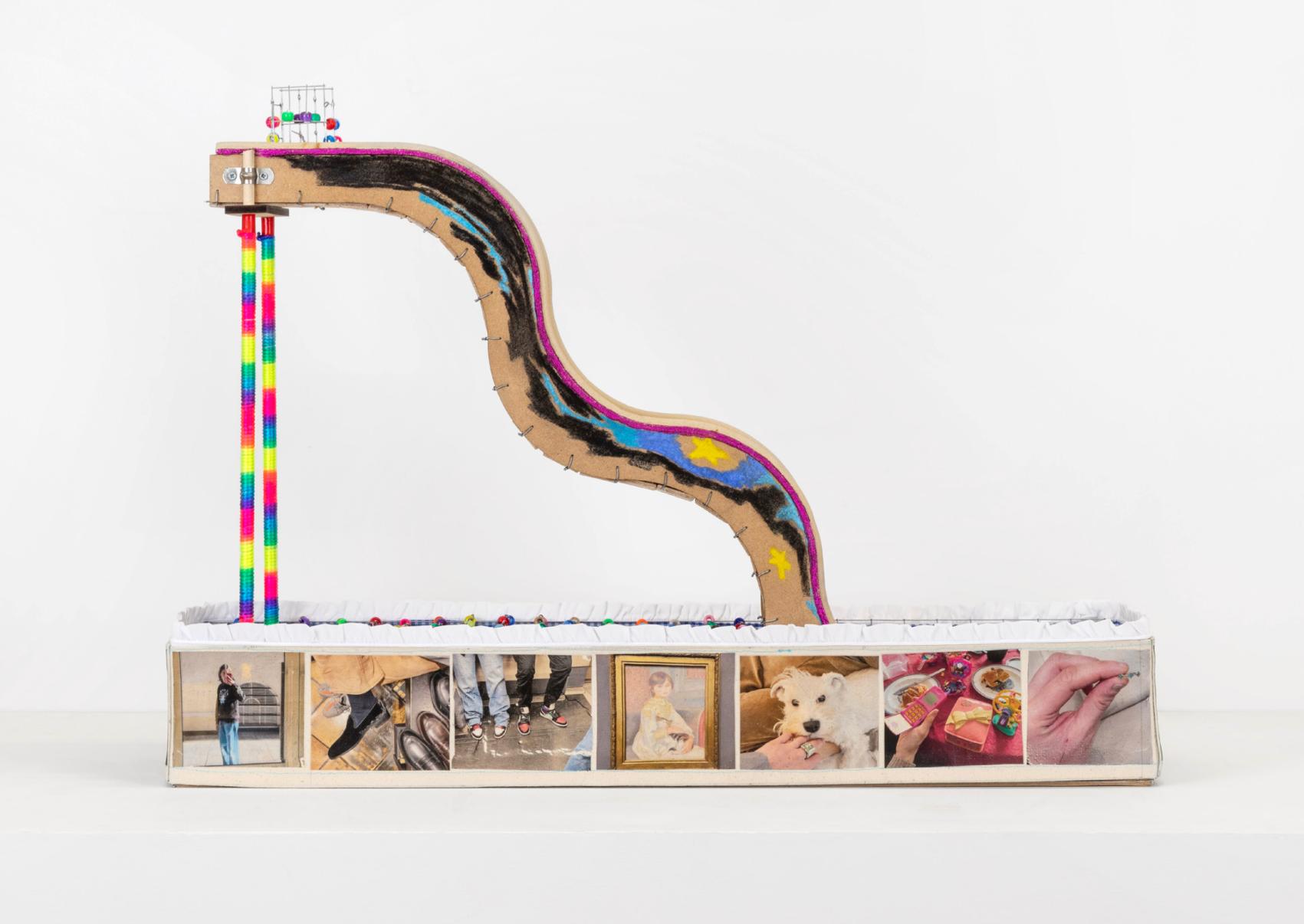 En écho aux subterfuges du maître, l’Italienne Guendalina Cerruti – portant la double casquette d’artiste et de scénographe – déploie un décor métallique dans la grange attenante au centre d’art essonnien. Des architectures squelettiques y accueillent les œuvres d’autres artistes invité·es. À l’intérieur se trouve un candélabre en bois et une tresse de cheveux synthétiques suspendue (Audrey Couppé de Kermadec), des contenants de verre soufflé remplis de pièces de monnaie (Lucas Erin), ou un simple portefeuille (Adrien Genty). À la place des chaînes et des menottes avec lesquelles les femmes étaient attachées par Houdini, les treillis métalliques sont recouverts de petites perles plastiques colorées.