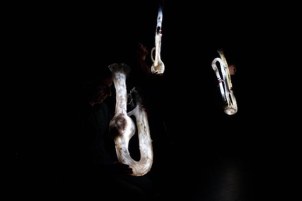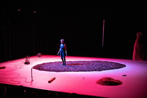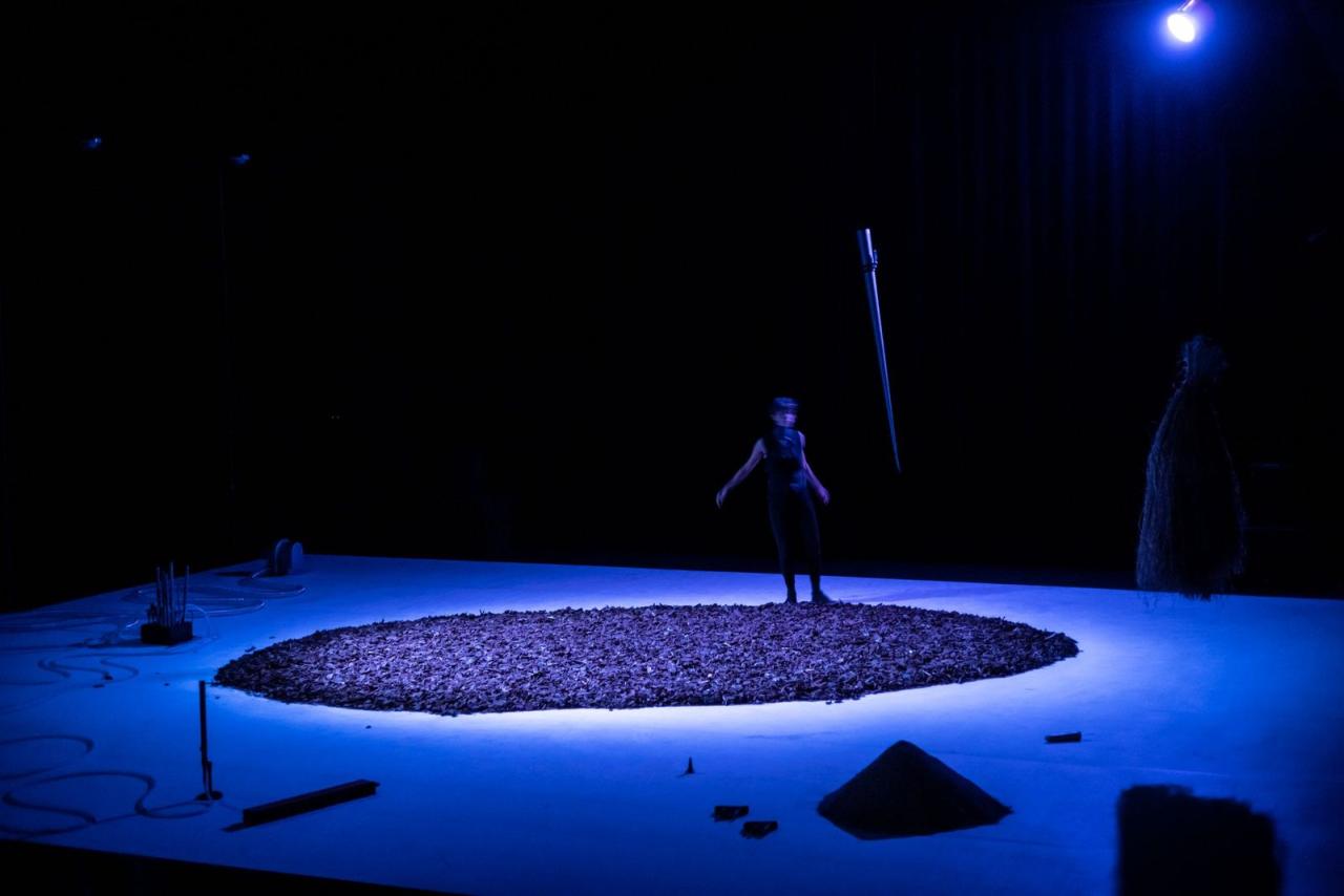 C’est bien un paysage qu’il nous donne à voir et à entendre, comme une sorte de traduction visuelle et gestuelle de l’étrange composition musicale qui en a été le point de départ. Autour d’une œuvre de Bastien Mignot, La Térra es un astre – un cercle d’écorces de pin de 5 mètres de diamètre disposé au sol au centre du plateau – et avec la complicité de l’interprète Pauline Simon se déploie – dans une quasi-pénombre, là encore – une dramaturgie organique, qui tantôt amplifie, tantôt même actionne les sons que l’on entend. Des chants d’oiseaux enregistrés viennent parfois se mêler aux sifflements, stridulations ou hululements produits par l’ensemble de 24 appeaux et tuyaux d’orgues disséminés sur la scène, reliés à une soufflerie silencieuse : un instrument que Clément Vercelletto a réalisé avec un luthier strasbourgeois, qu’il a baptisé engoulevent… et que l’on ne découvre qu’une fois les lumières allumées. Une proposition fragile et délicate qui oblige à tendre l’oreille, souvent fascinante dans ses entrelacs musicaux de matière minimale, tour à tour bruitiste et atmosphérique.