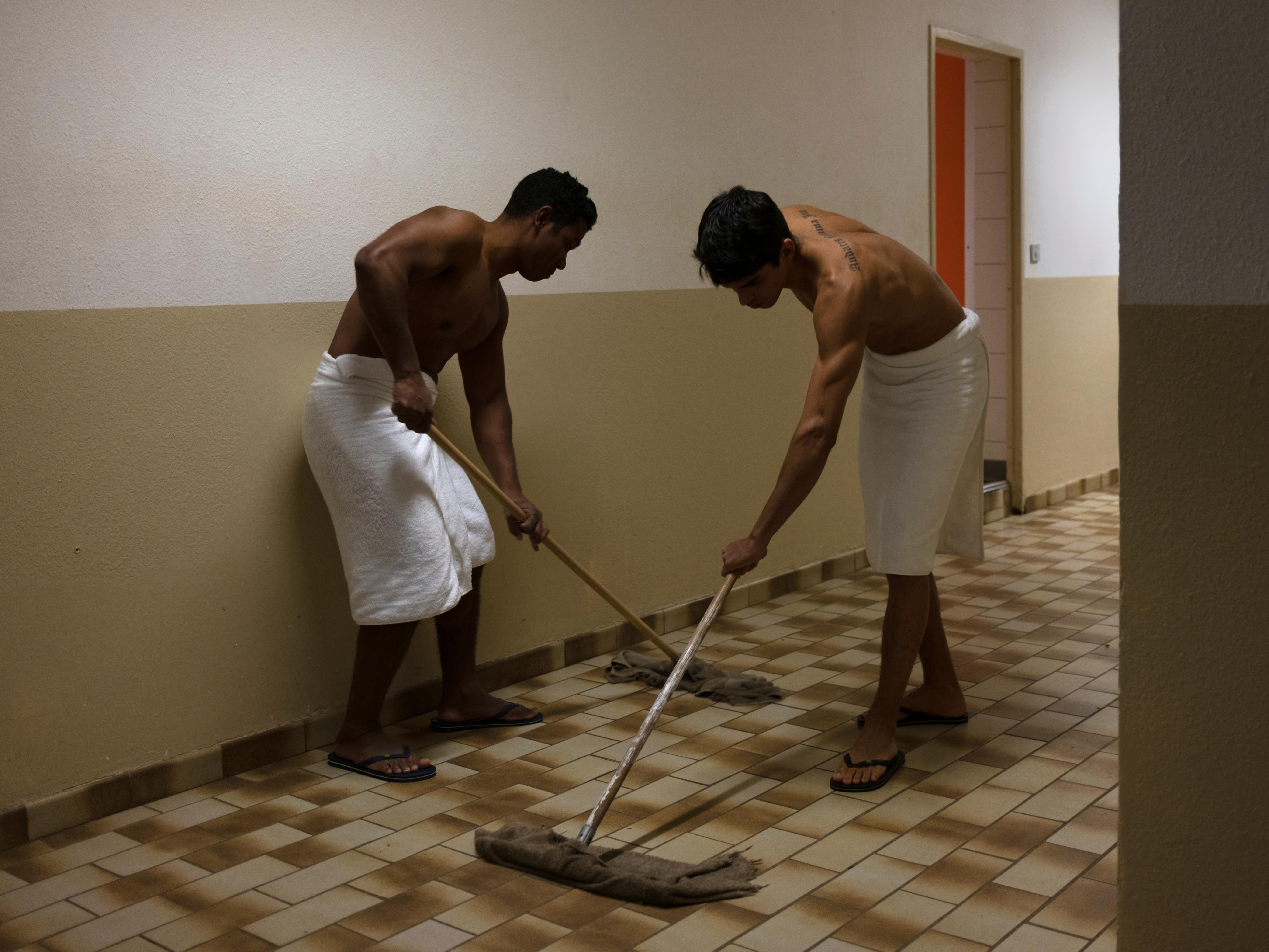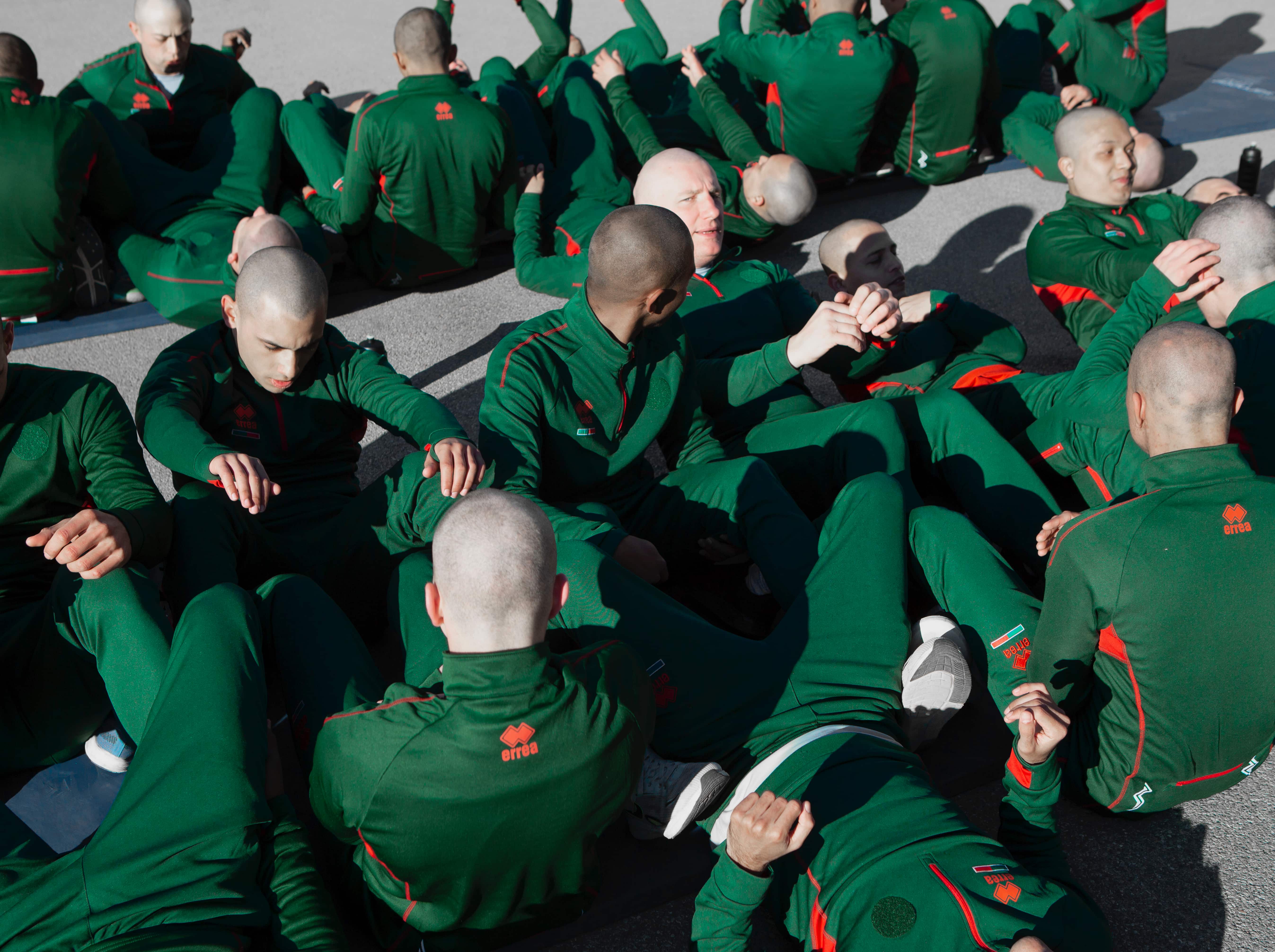 « Je comptais m’intéresser à l’armée régulière mais je me suis rendue compte que cette unité, qui a une image très forte et spécifique de guerriers ultra soudés, collait d’autant mieux aux thématiques que j’aborde dans mon travail : la perte de l’identité, la jeunesse, la masculinité, retrace Julie Joubert. J’ai eu la chance d’avoir un contact là-bas. Une fois la confiance établie, les portes se sont ouvertes. » Elle découvre la réalité d’un quotidien mené à huis clos, entre les réveils à 5 heures du matin, les entraînements à la chaîne, les devoirs de commémoration, l’attente interminable et les contrôles médicaux lors des phases de sélection. C’est dans la confrontation des scènes, dans la tension entre un envers et un endroit, que la photographe trouve sa vérité. Les corps alignés, quasi identiques, captés en plein exercice de musculation, ont une dimension architecturale qui raconte le poids de la discipline et la rigidité de l’institution. Les vestiaires, en revanche, sont peuplés de jeunes hommes en caleçon ou enroulés dans des serviettes, balayant le sol dans une chorégraphie plus triviale. Ailleurs, un torse athlétique et ruisselant, saisi en noir et blanc et coupé à hauteur de cou, se confond avec une sculpture chargée de rappeler l’idéal militaire : produire en série des corps performants. Bien différents de celui, pubère et recroquevillé, du garçon au crâne rasé et au regard mélancolique que la photographe immortalise dans un clair-obscur caravagesque.