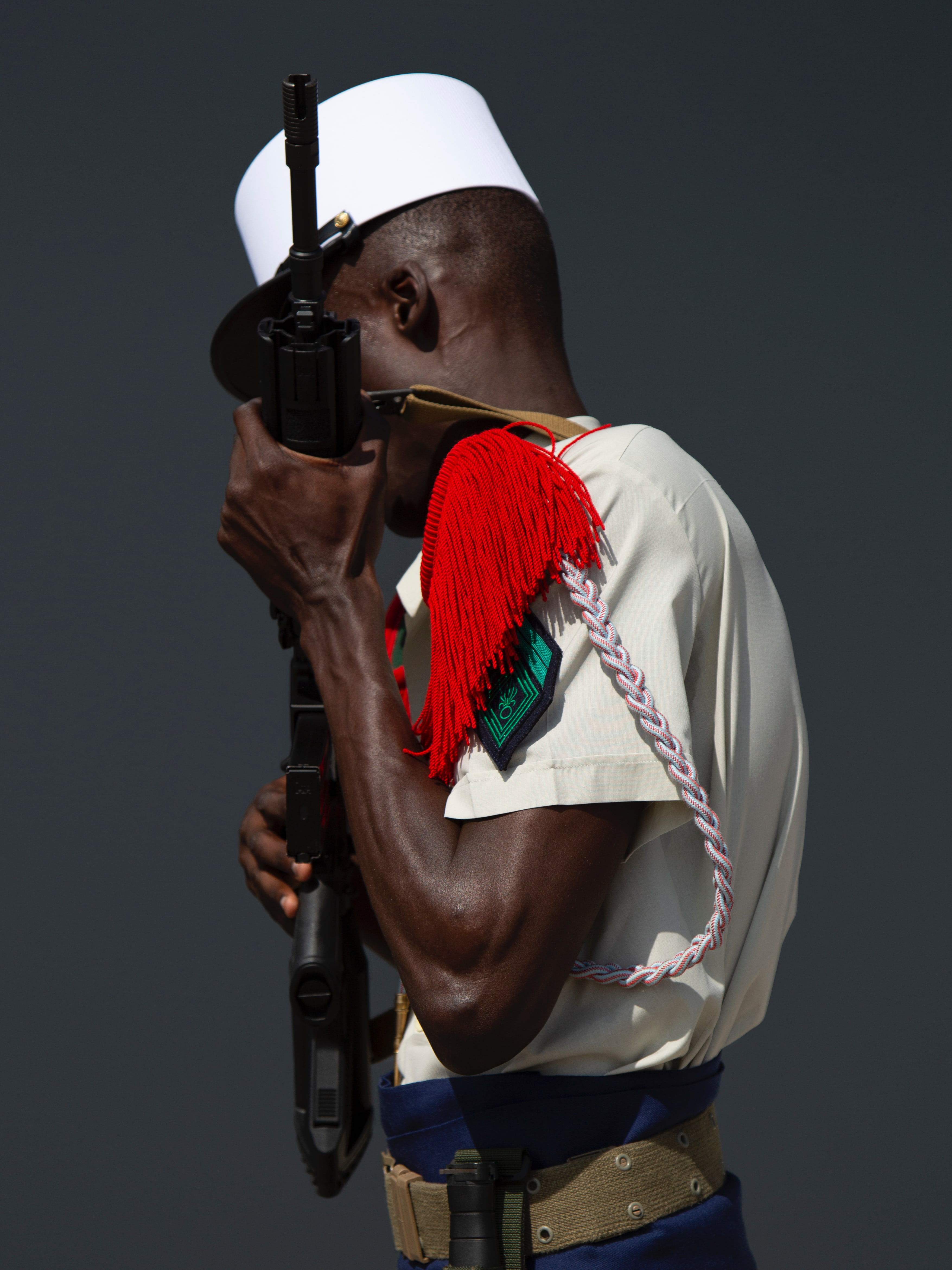Il porte le képi blanc vissé sur la tête et le Famas près du corps. Les épaulettes vertes et rouges sont bien en place et l’uniforme beige est impeccable. Pourtant, le portrait de ce légionnaire, cadré à l’américaine, perturbe : il se tient de trois quarts, le visage camouflé par le canon. « Au début, il était au garde-à-vous, face à moi, en position officielle. On a travaillé pendant vingt minutes, en plein soleil, isolés du groupe, alors qu’il devait rejoindre ses camarades. Une sensibilité particulière se dégage de cette image : il y a ce léger mouvement du corps qui se détourne, il ne tient pas son fusil comme la communication officielle de la Légion étrangère l’exige. » Appareil argentique, jetable ou numérique en main, au flash, en couleur ou en noir et blanc, de portraits en scènes collectives, Julie Joubert traque le détail pour subvertir la représentation strictement codifiée du légionnaire : « Ces différentes approches me permettent de naviguer entre l’uniformisation militaire et la diversité des profils qui s’engagent, de les humaniser. » Depuis deux ans, la photographe s’est immergée dans ce régiment d’élite exclusivement masculin, où règne le culte du corps, du sacrifice et de la loyauté, mais qui traîne aussi la réputation de lessiveuse pour repris de justice de toutes nationalités. La jeune femme a suivi les soldats dans les étapes de sélection et de recrutement au fort de Nogent-sur-Marne et à Aubagne, les a accompagnés durant leur formation à Castelnaudary et leurs entraînements au camp de La Courtine dans la Creuse, jusqu’à leur intégration au plus grand régiment de combat à Nîmes. Durant plusieurs sessions sur site, d’une dizaine de jours chacune, elle a vécu avec ces jeunes hommes qui changent d’identité, repoussent leurs limites physiques et psychiques pour épouser la Légion étrangère, présentée comme l’une des forces armées les plus redoutées et respectées au monde.